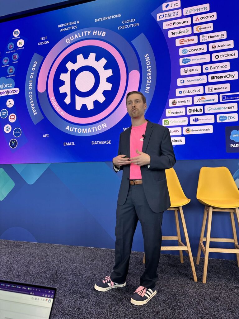 Provar’s Director of Technical Product Marketing, Michael Dailey, joined John Belo of Salesforce for Tools to Build, Test, and Release Agentforce, a theater session highlighting the latest advancements in Agentforce Builder and DevOps testing. The team showcased how the new low-code Agentforce Builder uses natural language to streamline agent creation, while the Agentforce Testing Center and observability tools provide continuous monitoring to ensure reliability, accuracy, and performance.